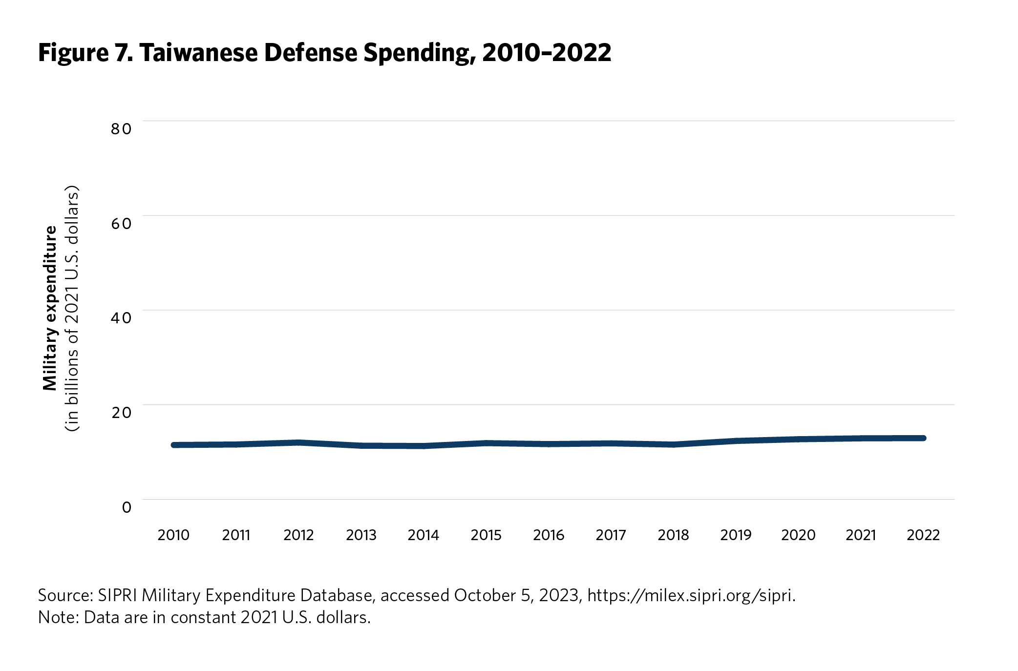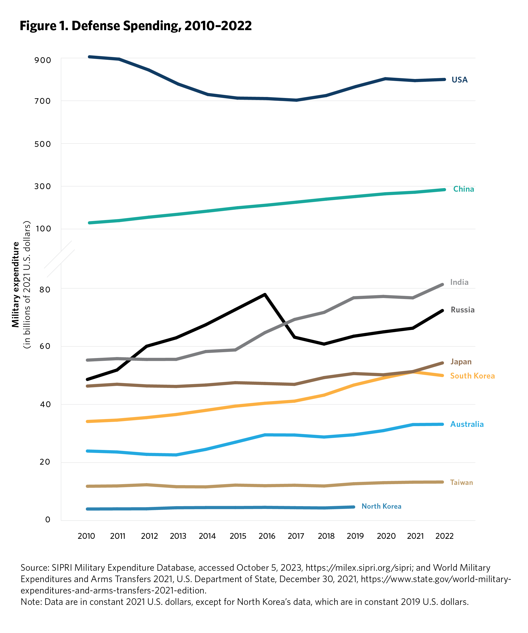 5 Ken Moriyasu, “‘Geopolitical Powder Keg’ Asia Jacks Up Global Military Spending,” Nikkei Asia, August 25, 2022, https://asia.nikkei.com/Politics/International-relations/Indo-Pacific/Geopolitical-powder-keg-Asia-jacks-up-global-military-spending . Time series data on regional defense spending is available from the SIPRI Military Expenditure Database, Stockholm International Peace Research Institute, accessed September 2023, https://www.sipri.org/databases/milex.